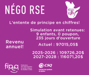 Dans l’info négo vous pouvez constater que la FIPEQ vous a remis un calculateur afin de vous faire une idée approximative des montants que vous pourriez recevoir avec les augmentations négociés. Rappelons que le calcul a été fait avec un total de 235 jours d’ouverture pour chacune des années.