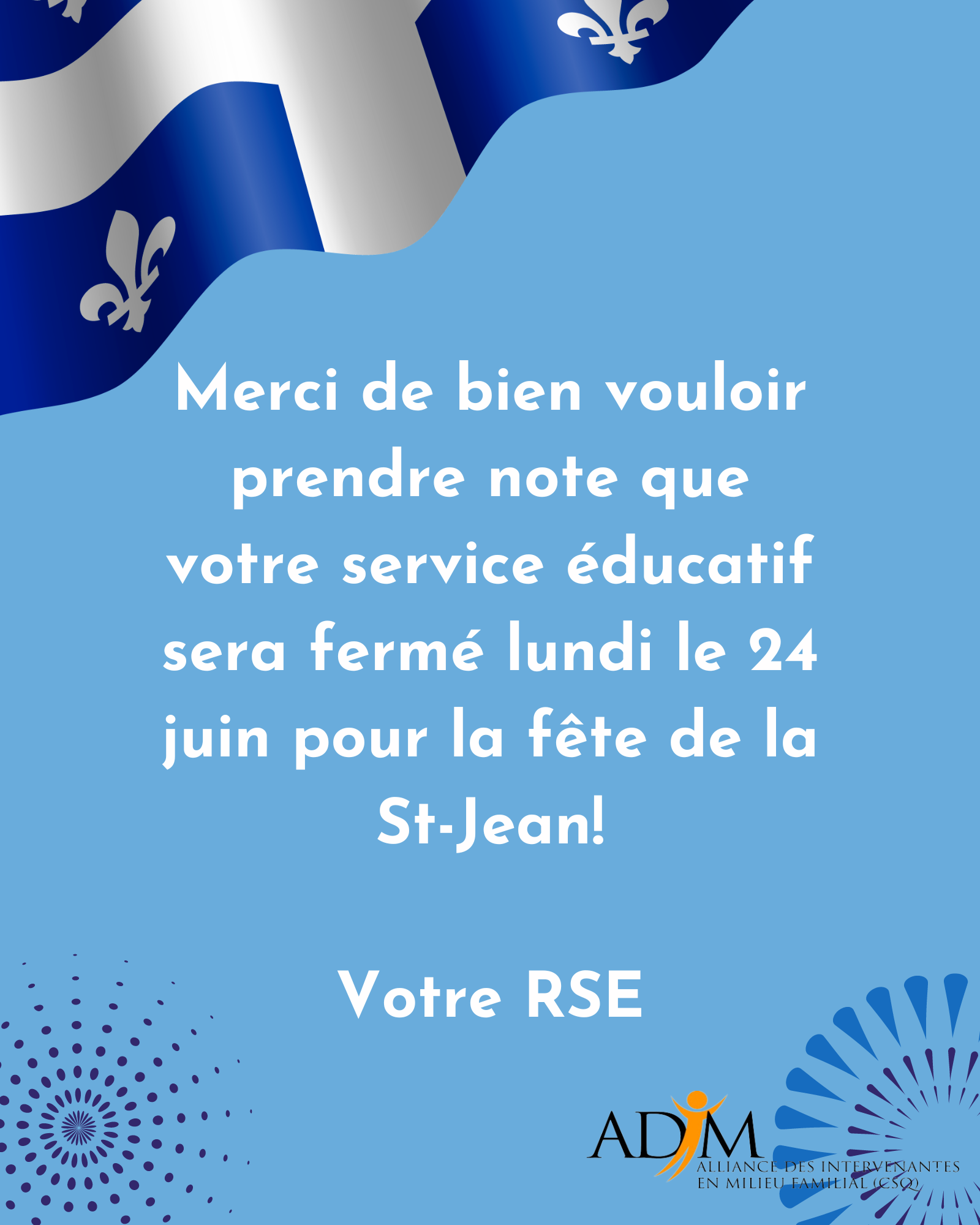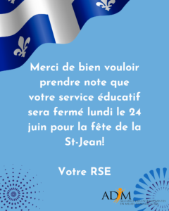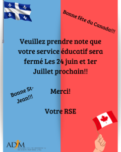 Comme à chaque congé férié, votre ADIM mets à votre disposition des affiches que vous pouvez afficher dans vos milieux afin d’aviser les parents d’une prochaine fermeture.