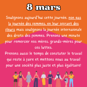 Il ne s’agit pas de la journée de la femme et une occasion d’offrir des fleurs à sa femme mais bien une journée pour souligner tout le travail accompli et le travail qui reste à faire.